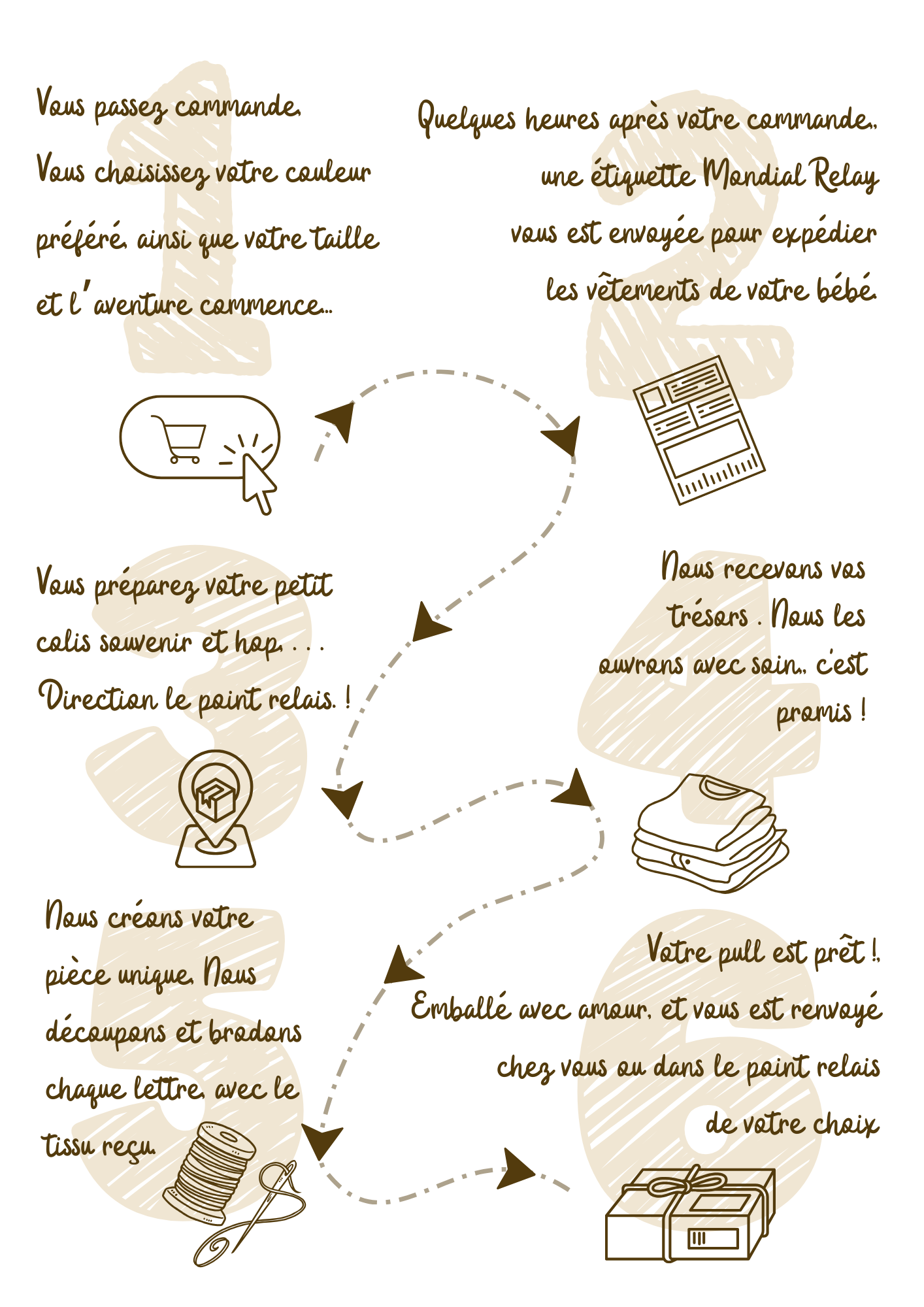 Chaque pull Création est une pièce unique, brodée dans notre atelier à partir des vêtements de votre enfant. Un tissu utilisé par les câlins, un petit pyjama qu'on a jamais vraiment pu ranger... et voilà qu'il renait dans une broderie tendre, intégrée dans un mot fort.